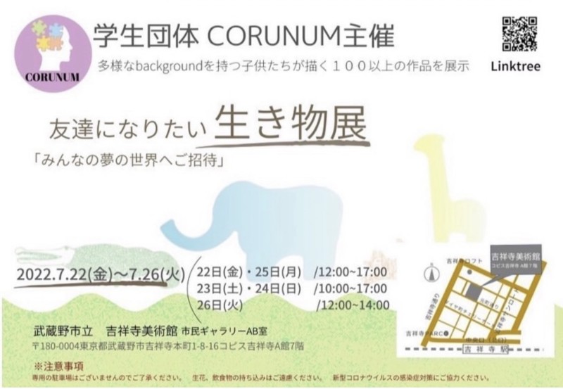 多様なバックグラウンドを持つ子ども達が描いた「友達になりたい生き物展」を多くの方々にご協力いただき、2022年7月22日〜26日に武蔵野市立 吉祥寺美術館にて開催しました。